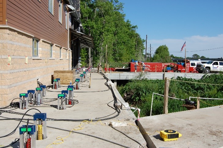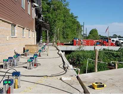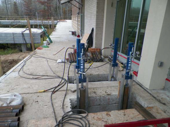 The Cajun Visitor Center is an approximately 7,500 square foot building constructed on 57 driven pre-cast piles that underwent significant settlement after construction. Magnum Geo-Solutions mitigated this settlement by stabilizing and lifting the building, using wide steel angle brackets attached to cap sill beams, and 4.5” diameter steel piling installed by jacking. Four piles with brackets were installed around each existing driven pre-cast pile for a total of 228 piles. After a successful installation, the piles were then fitted with a lifting ram, which re-leveled the building